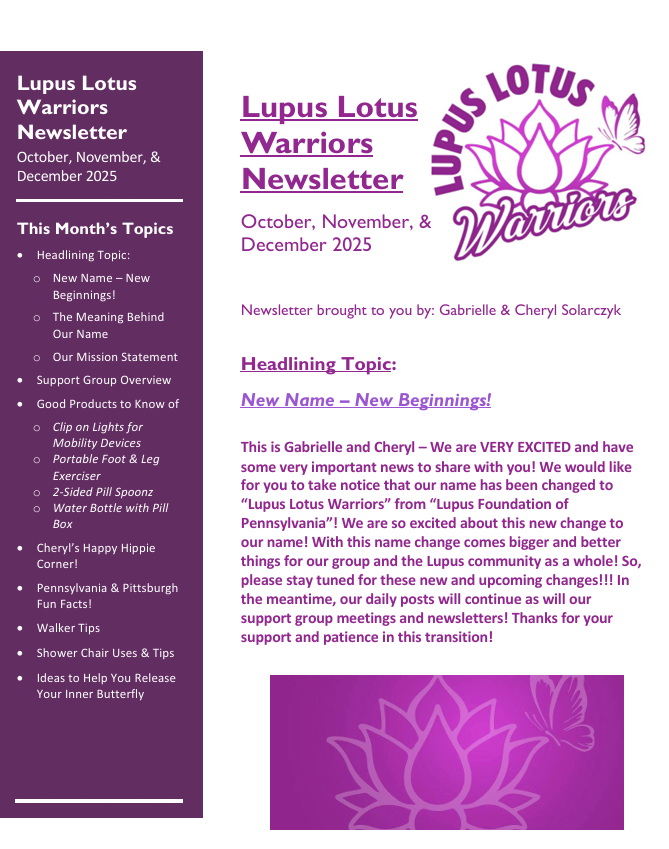 Our newsletter goes out quarterly, meaning four times a year. Each quarter covers three months (January, February, March) (April, May, June) (July, August, September) (October, November, December). For every newsletter there are six topics that stay constant and they include: a headlining topic, summary of support group topics from the past three months, a list of topics for next three support group meetings, four good products to know about that help navigate daily living, Pennsylvania & Pittsburgh fun facts (since our hometown and roots are from PA!), and Cheryl’s happy hippie corner (a focus on inspirational messages, mantras, affirmations, and mindfulness). From there, anything we find interesting, relevant, or necessary, has a chance of being added to that quarter’s newsletter. Some newsletters can be shorter while others can be longer, it all depends on the information within. That also means that some can have a more serious tone, while others are more light hearted. If there is ever a topic that you wish to see in a newsletter, you can send us an email with a suggestion and we will do our best to accommodate! However, the main goal is to be a helpful yet fun tool and aid to anyone and everyone, but especially Lupus warriors and those in the Lupus community! There is an email mailing list, and this list receives the newsletters first when they originally go out. After a period of time, we do make the newsletters publicly accessible via Facebook and Google Drive. However, if you want to get it first, make sure to sign up below!